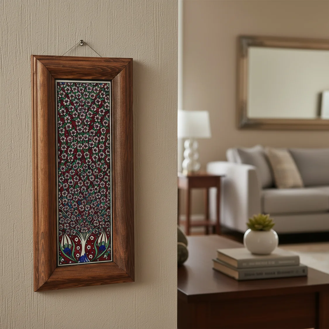 El Yapımı Ahşap Çerçeveli ve Seramik Karo Detaylı Dekoratif Duvar Aynası – Busanat Özel