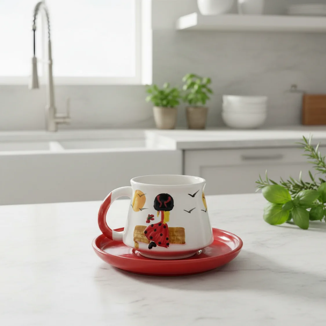 Günlük kullanımınıza sanatsal bir dokunuş katın. Tamamen el işçiliğiyle hazırlanan bu özel kupa ve tabak seti, hem şıklığı hem de fonksiyonelliği bir arada sunuyor. Benzersiz tasarımıyla kendinizi veya sevdiklerinizi şımartın.