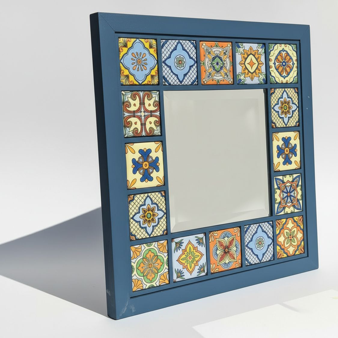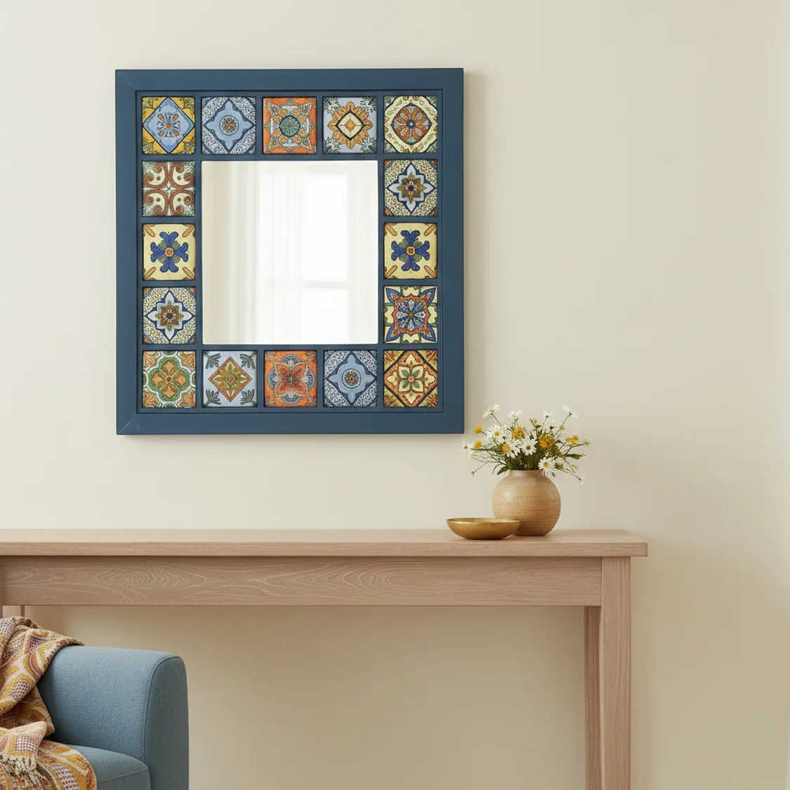 Evinize sanatsal bir dokunuş katın! Doğal ahşabın sıcaklığı ile geleneksel karo desenlerinin zarafetini birleştiren bu tasarım ayna, antre, salon veya yatak odanızın havasını anında değiştirecek. Minimalist ve rustik dekorasyonun mükemmel uyumu
