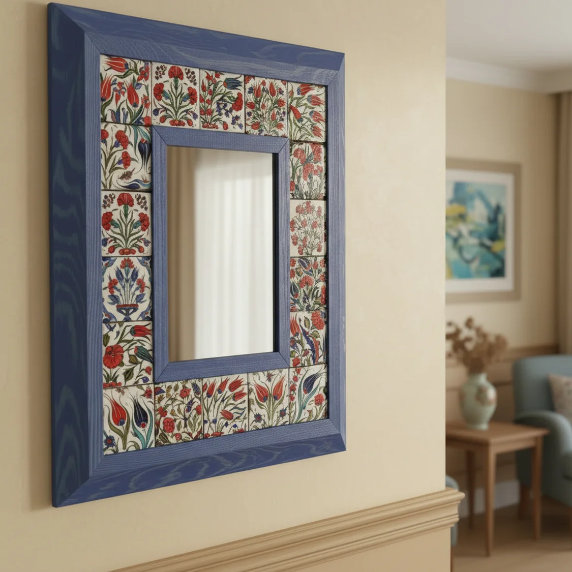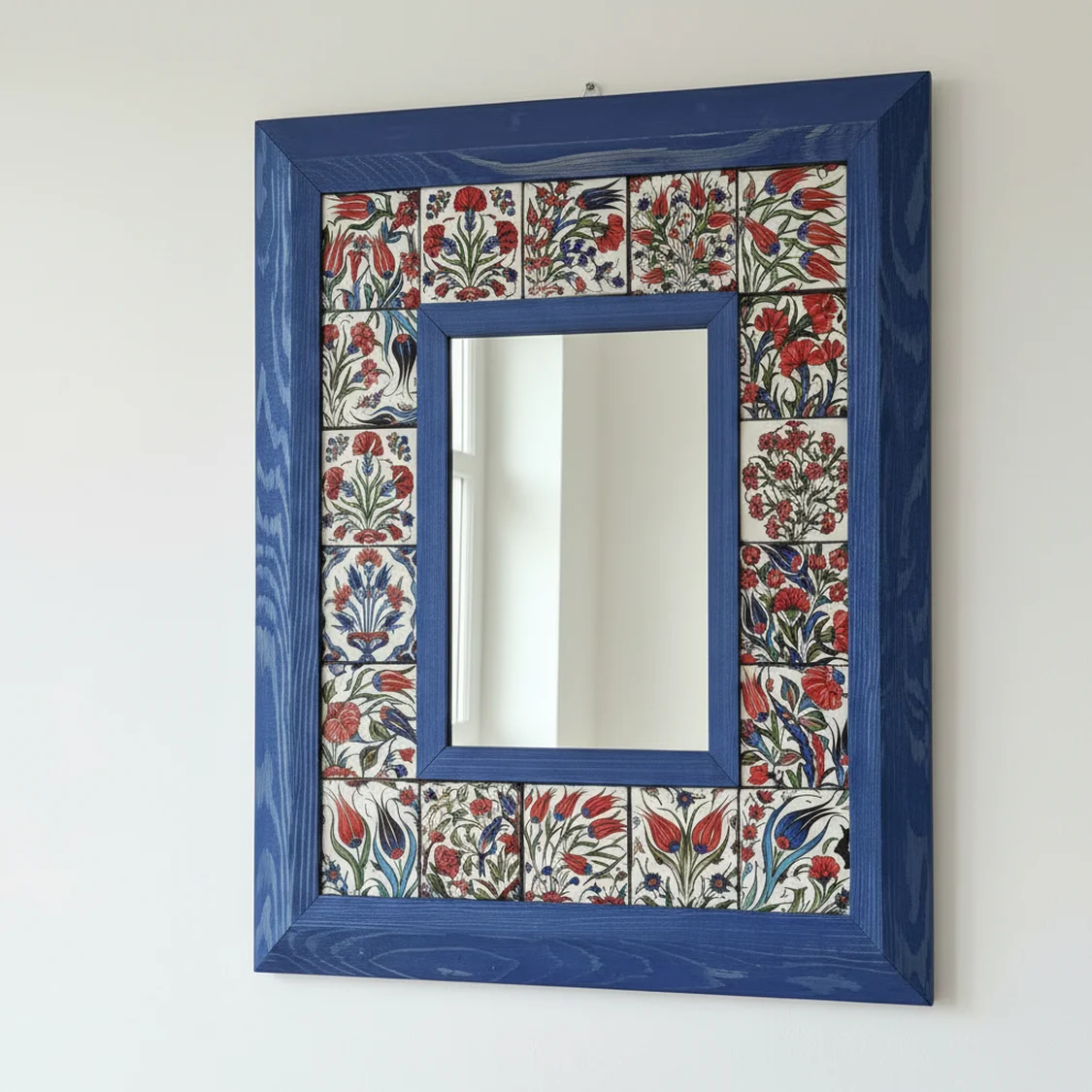 El Yapımı Ahşap Çerçeveli ve Seramik Karo Detaylı Dekoratif Duvar Aynası – Busanat Özel