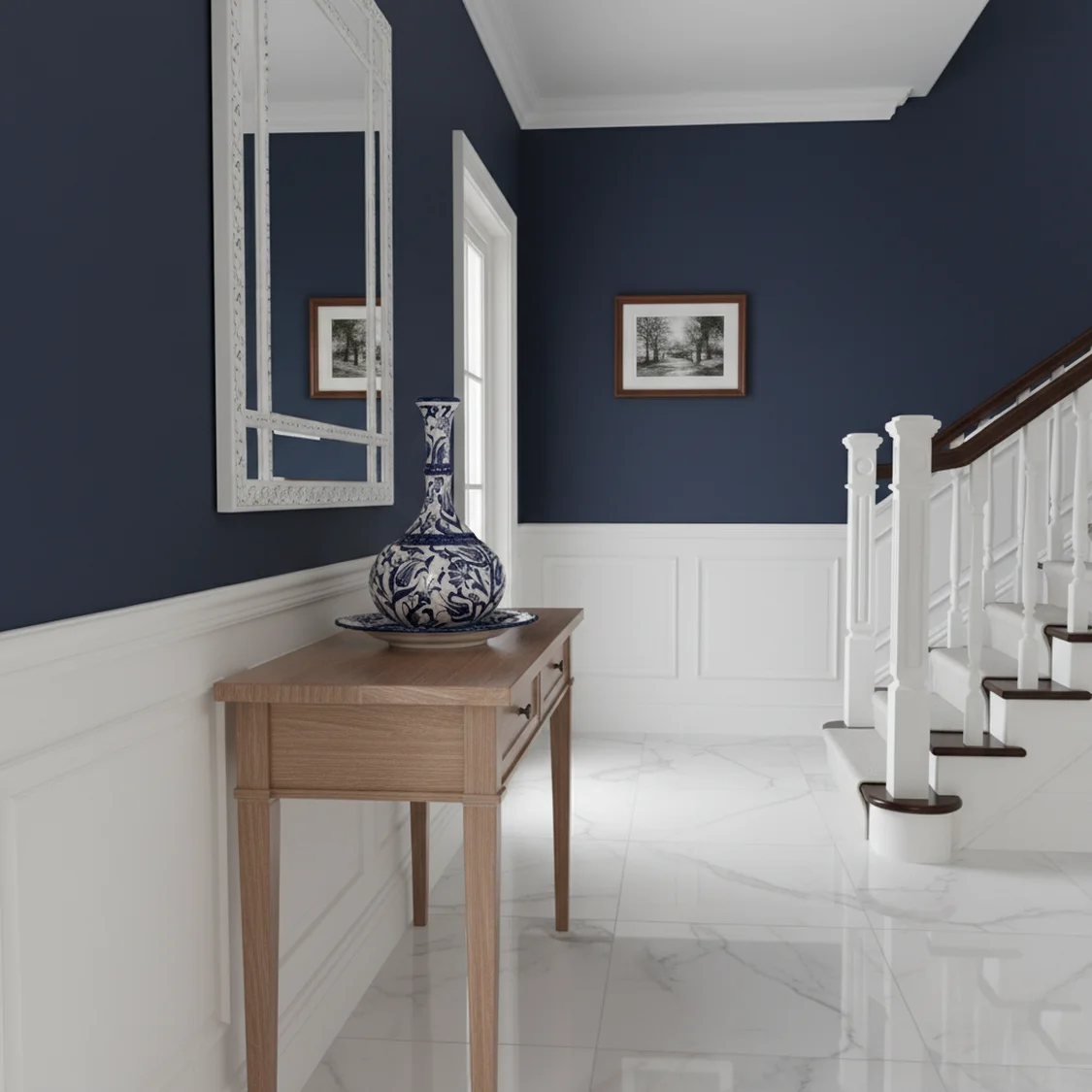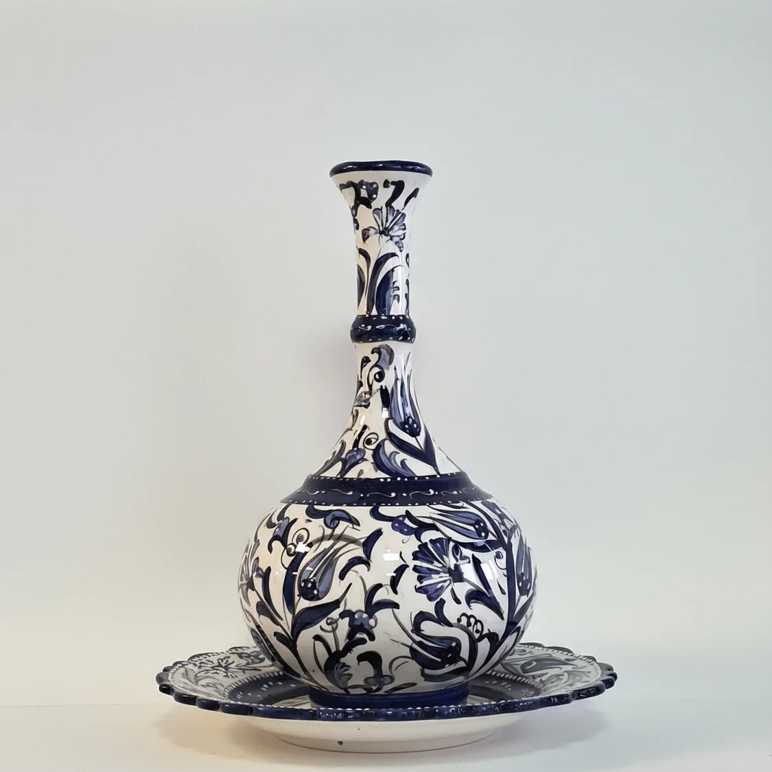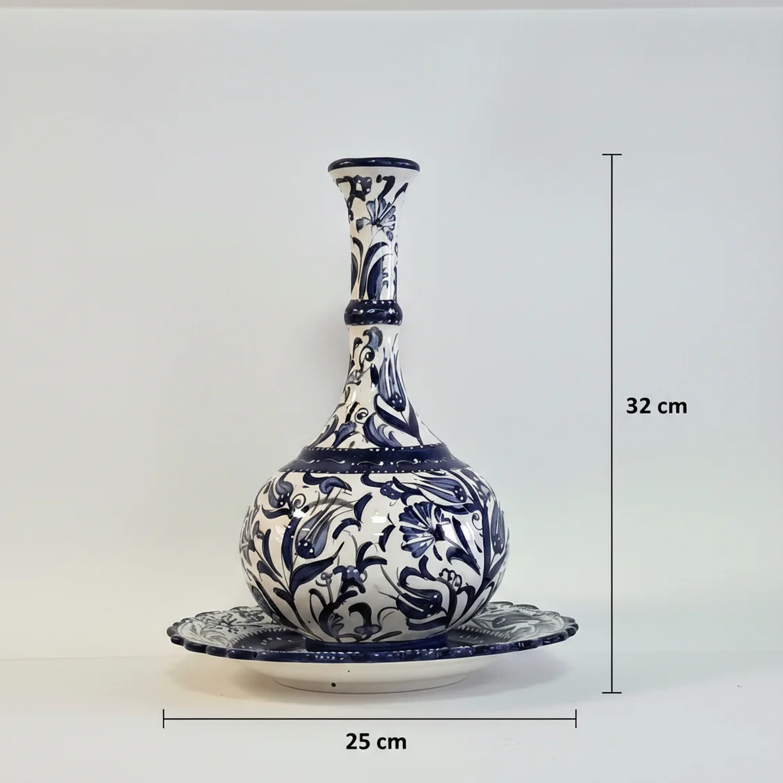 El Yapımı Klasik Çini Vazo – Lacivert Beyaz Desenli (25×32 cm)