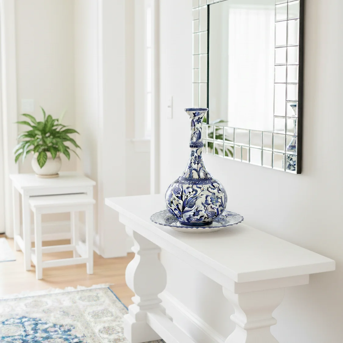 Usta ellerde şekillenen bu el yapımı çini vazo, 25 cm genişliği ve 32 cm yüksekliği ile mekanlarınıza sofistike bir dokunuş katar. Klasik lacivert-beyaz motiflerle bezeli bu özel tasarım, hem koleksiyonluk bir parça hem de eşsiz bir dekorasyon objesidir.