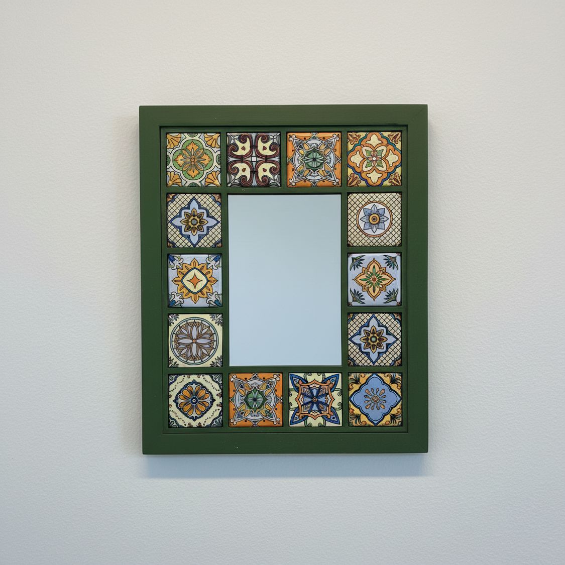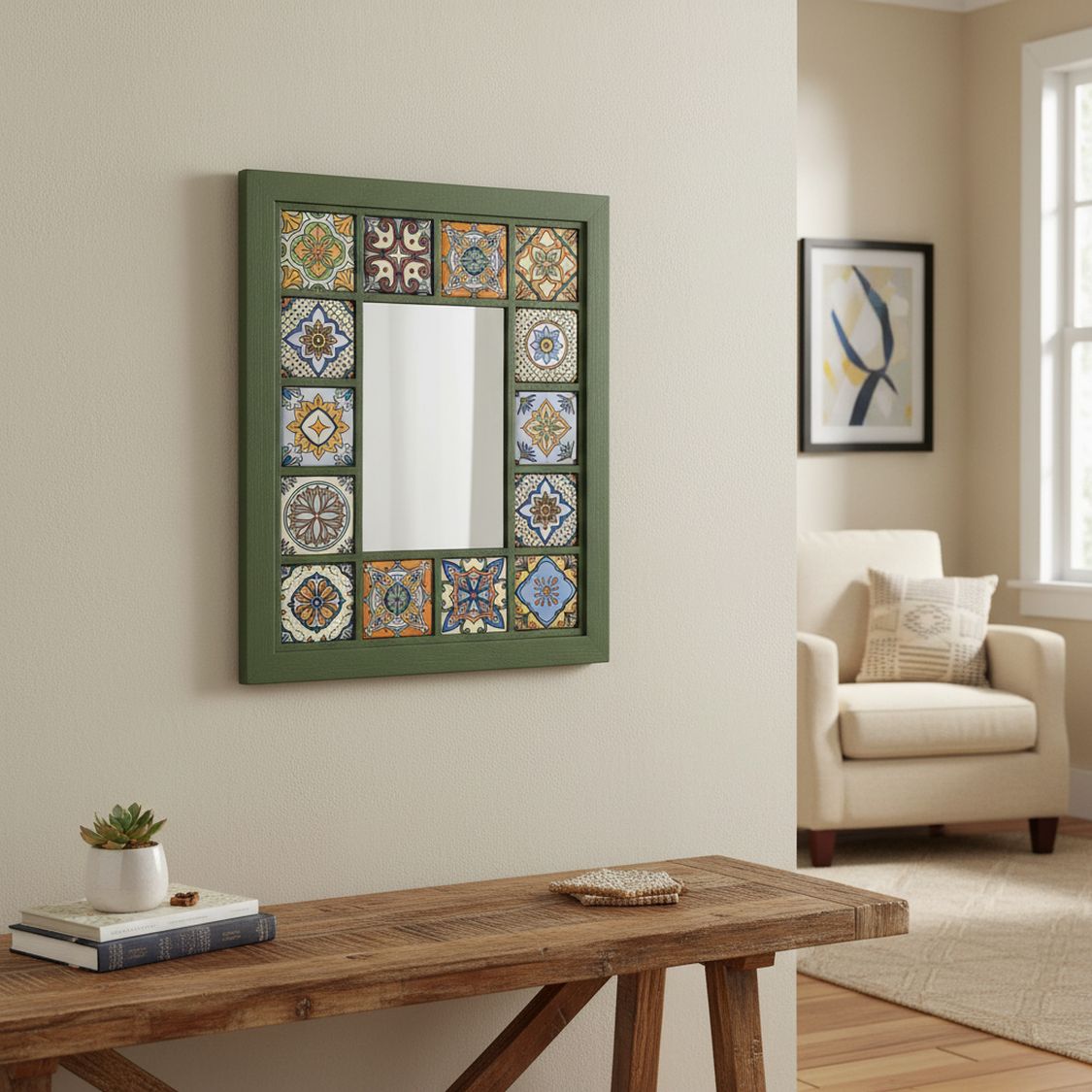 Doğal Ahşap Çerçeveli ve El İşçiliği Seramik Baskılı Özel Tasarım Dekoratif Duvar Aynası 30X30