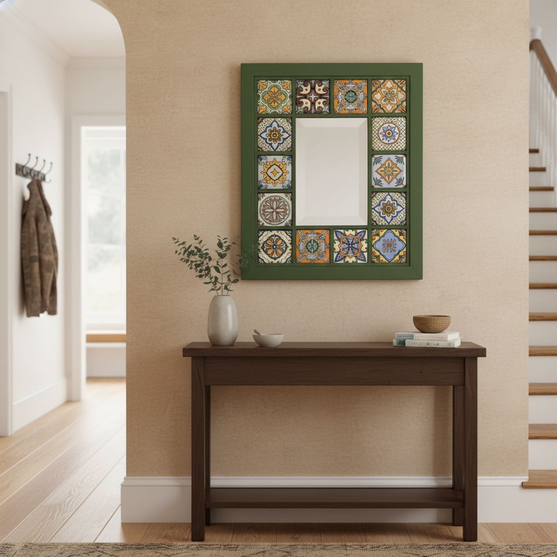 Modern Ahşap Çerçeveli El Yapımı Karo Desenli Dekoratif Duvar Aynası