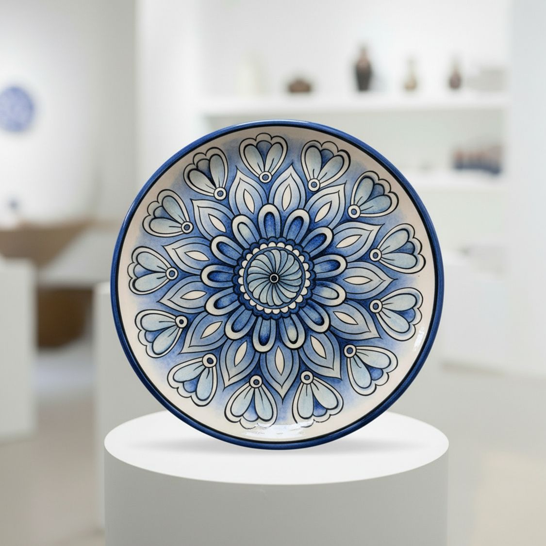 Evinizin enerjisini değiştirecek sanatsal bir dokunuş! Geleneksel motiflerin modern illüstrasyonlarla buluştuğu bu özel tasarım dekoratif tabak, tamamen el işçiliğiyle hazırlanmıştır. Duvar dekorasyonu veya masa üstü aksesuarı olarak kullanıma uygun olan bu eser, mekanınıza sofistike bir hava katar.
