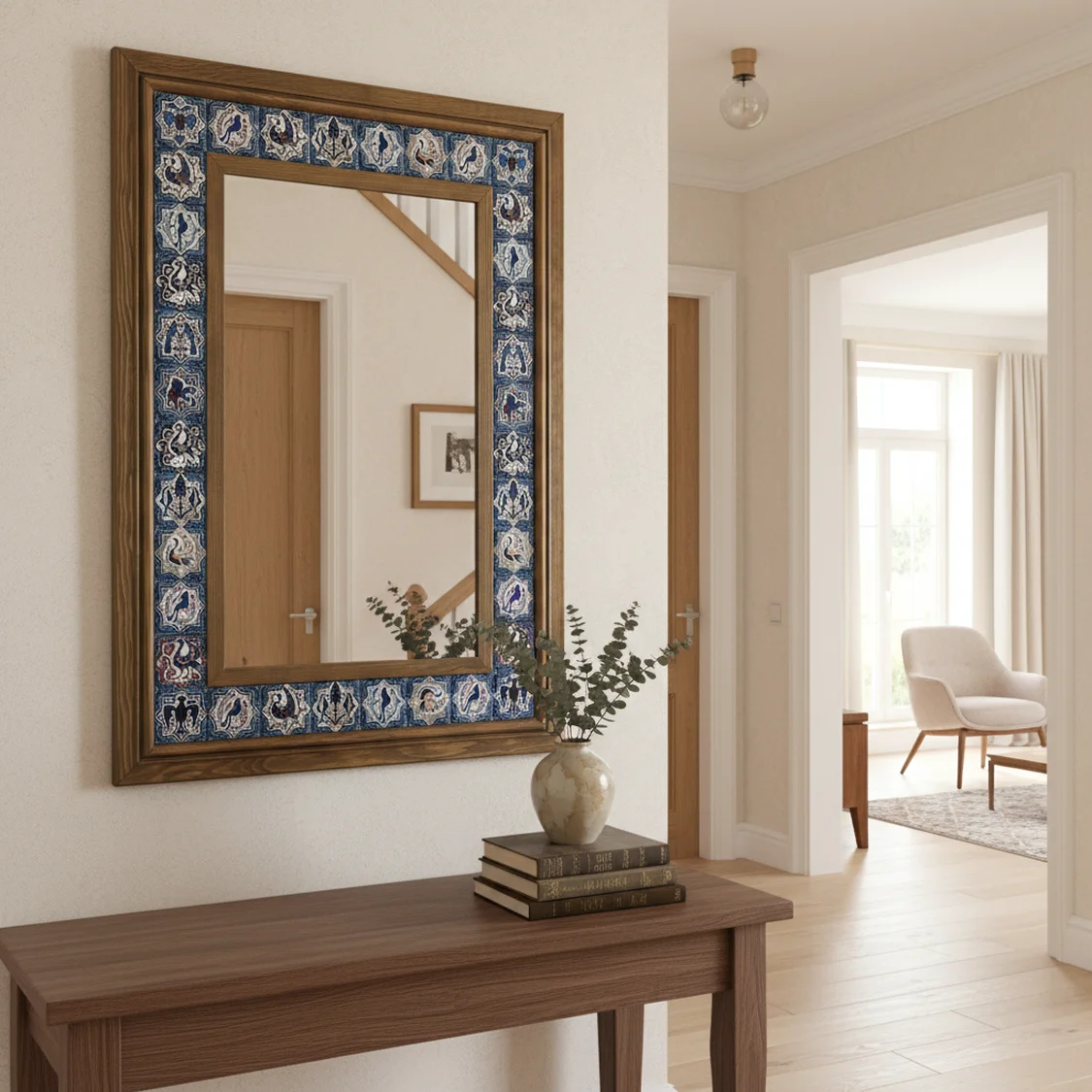 Selçuklu sanatının zarafetini duvarlarınıza taşıyın. Tamamen el işçiliği ile hazırlanan bu özel tasarım ayna, dayanıklı masif ahşap çerçeve içerisine yerleştirilmiş, geleneksel Selçuklu geometrik desenli seramik karolarla bezelidir. Hem antre hem de salon dekorasyonu için eşsiz bir odak